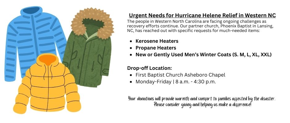Hurricane Helene has left many families in desperate need, and we have an opportunity to make a real difference. FBC Asheboro is partnering with Phoenix Baptist to collect essential supplies for those affected by the storm.